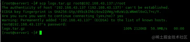 [root@server1 ~]# scp logs.tar.gz root@192.168.43.137:/root