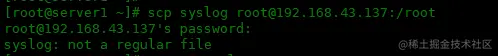 [root@server1 ~]# scp syslog root@192.168.43.137:/rootroot@192.168.43.137's password: syslog: not a regular file