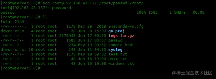 [root@server1 ~]# scp root@192.168.43.137:/root/passwd /root/