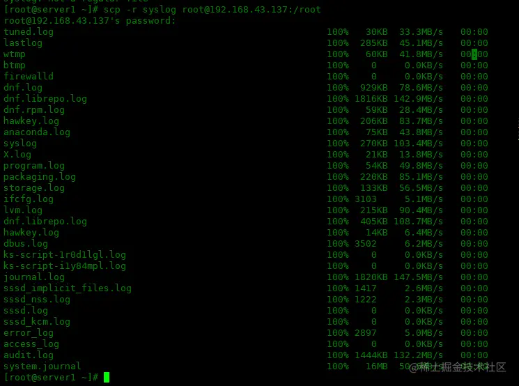 [root@server1 ~]# scp -r syslog root@192.168.43.137:/root