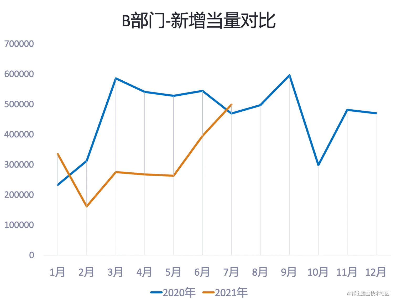 下图显示,B 部门的人均产能偏低,继续下钻查看部门详情,显示 B 部门产能有显著降低的趋势。