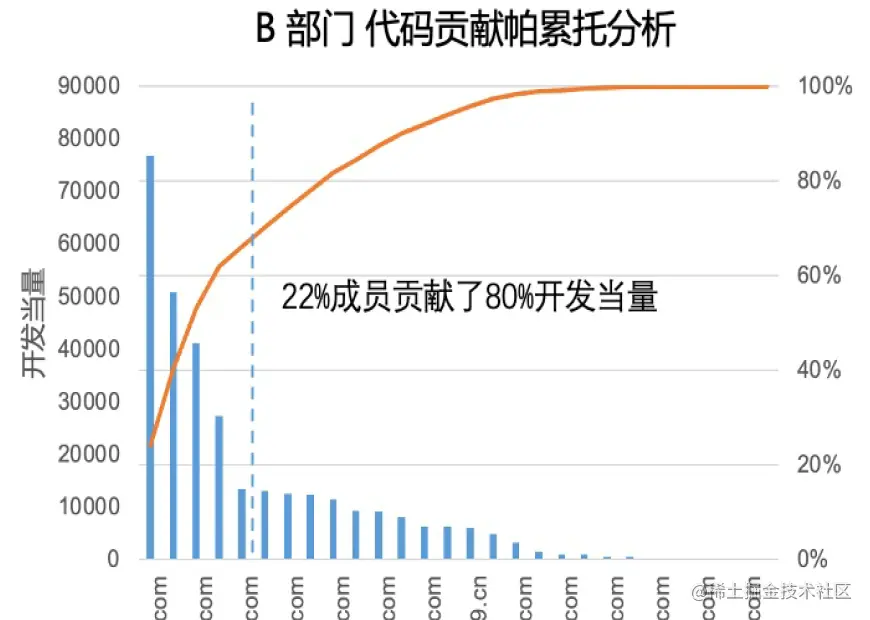 在团队中,某一部分工作延期较频繁,经常成为项目关键路径上的活动。技术负责人对该部分的相关开发人员近期产能进行帕累托分析,发现 80 %的代码工作量由 22% 成员贡献,反映出该部分工作存在任务分配不合理、不均衡,少数成员承担过多任务的情况,这也呼应了上一段提到的任务积压现象。
