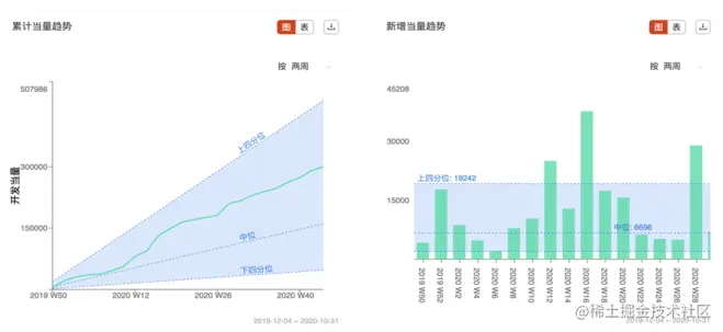 为了验证团队协作行为是否对效率产生了影响,技术负责人可以从资源效率出发,进一步下钻至个人级,使用帕累托图去分析开发者的产能分布;也可以从流动效率出发,观察需求交付周期趋势,以及各环节的时长分布。