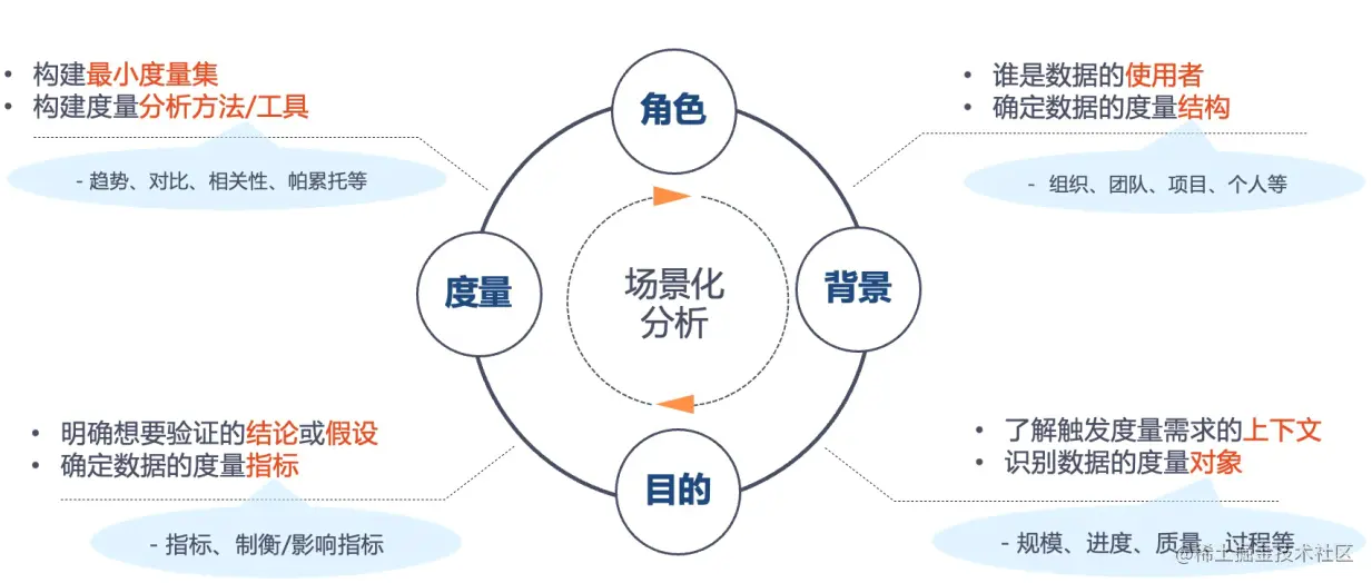 当我们用产品思维重新思考效能度量这件事,『场景化』就成为必要条件。可以从目标出发,借助场景化分析,明确以下四个要素,进而设计效能度量方案: