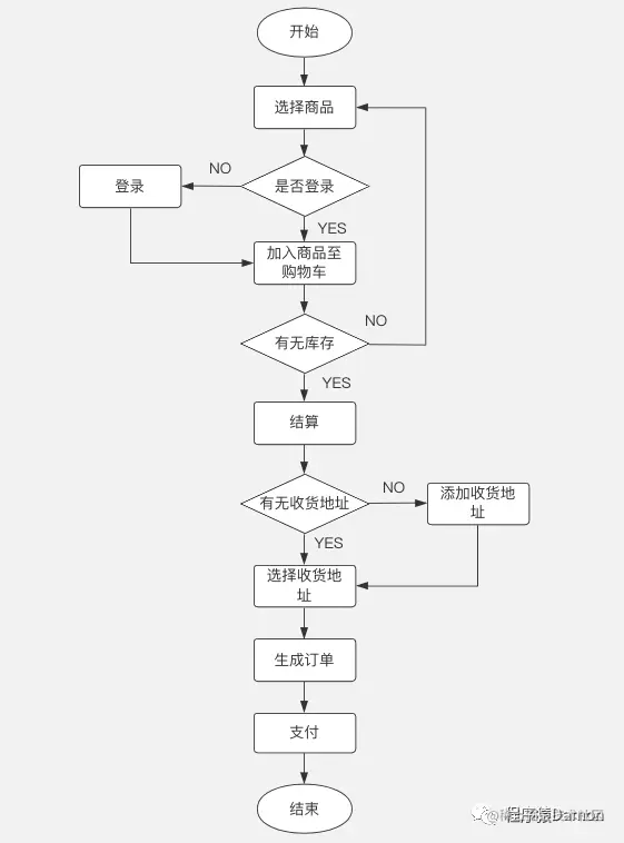 在电商行业,主要的功能就是购物,至于其他的,都是为购物作铺垫、营销手段:直播、促销、发优惠券等。从用户的角度来说,其实网上 shopping 的逻辑很简单:选中想要买的,支付 money 就 OK 了。但对于网站,或者说运营服务平台来说,其逻辑远没有那么简单。下面是一个简单的购物流程图: