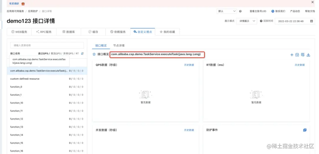 重启应用后,在接口详情页的自定义埋点tab中,就可以看到AHAS收集的自定义埋点接口数据,接口名称组成为类名:方法名的格式。