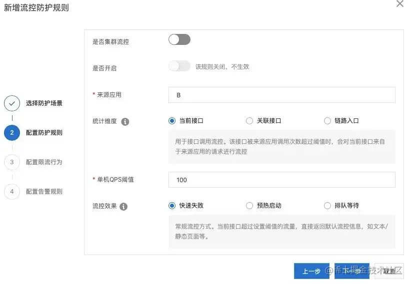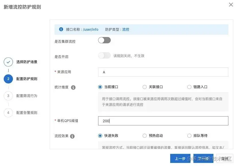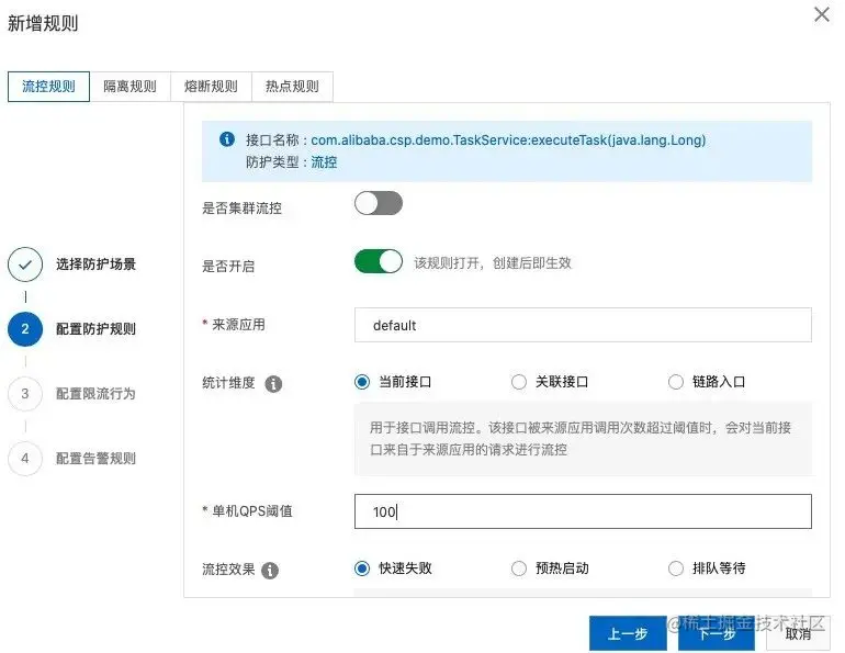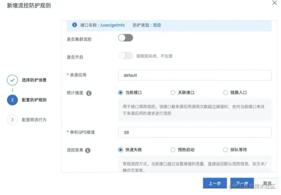 - 来源应用:设置为default,即对所有调用方都一视同仁,对整个系统的调用进行限流。关于这个配置的用法,会在后面的“针对其他上游系统调用的限流”部分展开讨论。