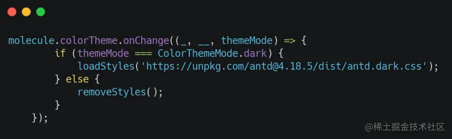 以上代码的大致意思是,当 Molecule 的主题发生改变的时候,如果改变后的主题是暗黑主题,那么我们就加载 Ant Design 的暗黑主题风格的样式文件,否则我们移除 Ant Design 的暗黑风格主题样式文件。