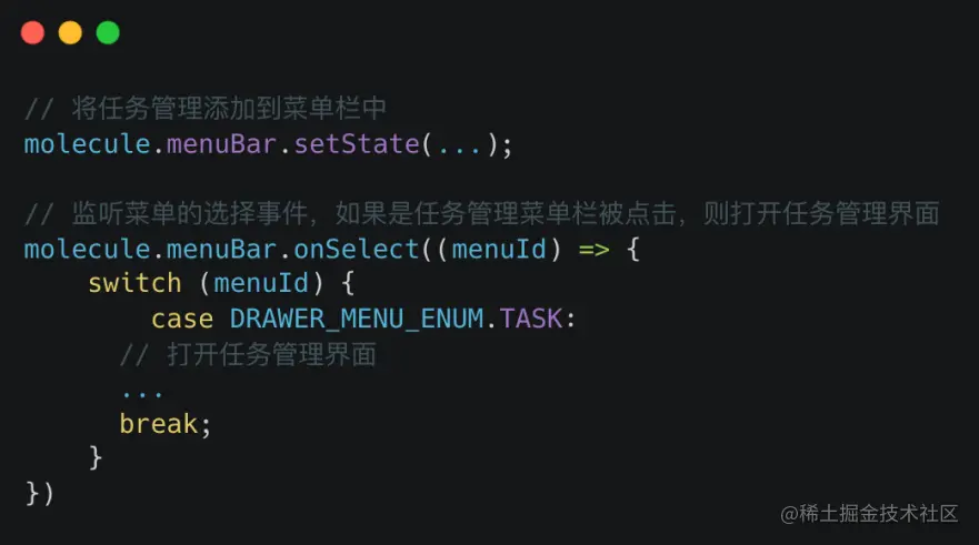 得益于 Molecule 提供的强大的扩展(extension)机制,我们可以在扩展中根据自身需求高度定制化页面中任何可见或不可见的元素。例如在开发任务管理时,为了解决页面之间来回切换跳转的问题,我们通过将任务管理添加到 Molecule 的菜单栏中,并且监听菜单栏的事件后打开 Ant Design 的抽屉组件渲染不同组件内容。