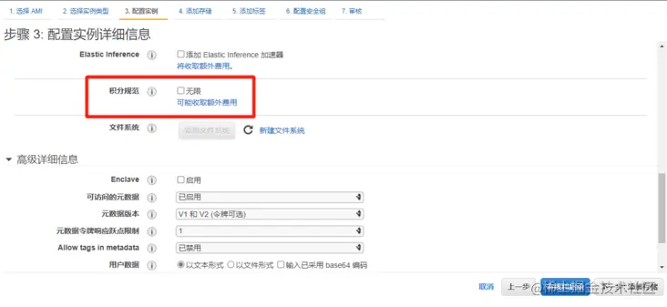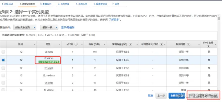 在选择实例类型页面,我们选择 t2.micro,我们看到这个类型标注了“可免费试用”,如果实际情况有出入,选个免费的就行。点击“下一步:配置实例详细信息”。