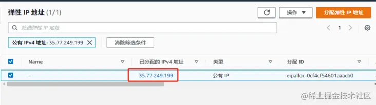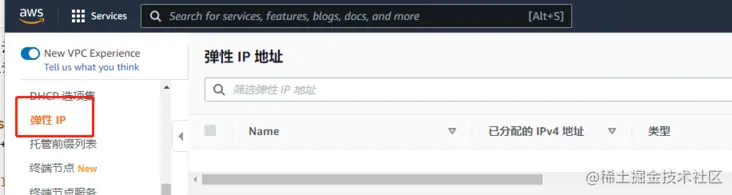 实例创建好后是没有固定 IP 的,只有临时的 IP,我们接下来用 VPC 分配一个固定 IP,具体的操作,先同上面一开始的步骤,搜索 VPC,然后点击第一个选项,会跳转到 VPC 控制面板。在左侧菜单项选择“弹性IP”,然后点击右上角”分配弹性 IP 地址“然后就能得到一个固定的IP地址,记住这个 IP 地址。