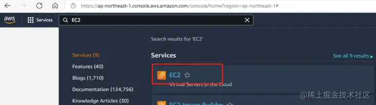 顶部搜索框位置输入 EC2,然后选中。