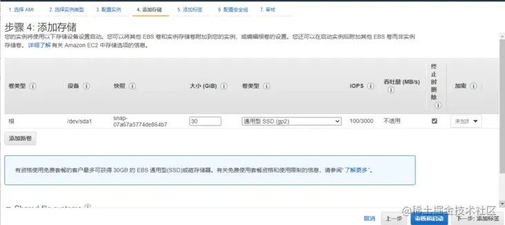 在添加存储页面,我们将根卷大小更改为 30GB,因为亚马逊云提供的免费套餐最大为 30GB。点击“下一步:添加标签”。