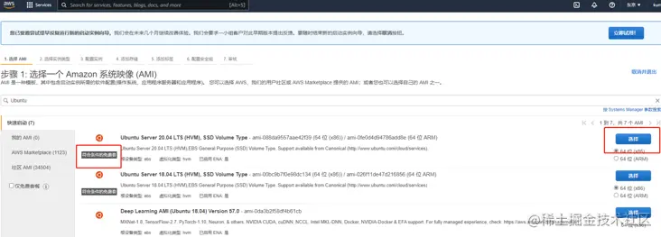 然后再操作页面,输入 ubuntu 后按 enter 键,会根据条件展示可使用的操作系统,然后根据提示选择符合条件的免费套餐即可,我这里选择 Ubuntu Server 20.04。