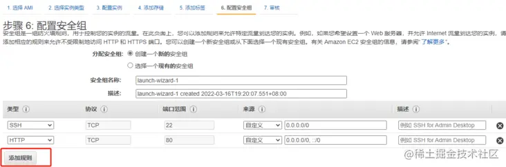 配置安全组页面,需要创建一个新的安全组,选择 HTTP 类型的,没有其他需求的话,不用做任何修改,0.0.0.0/0,代表任意IP可访问,后面::/0代表 IPv6。