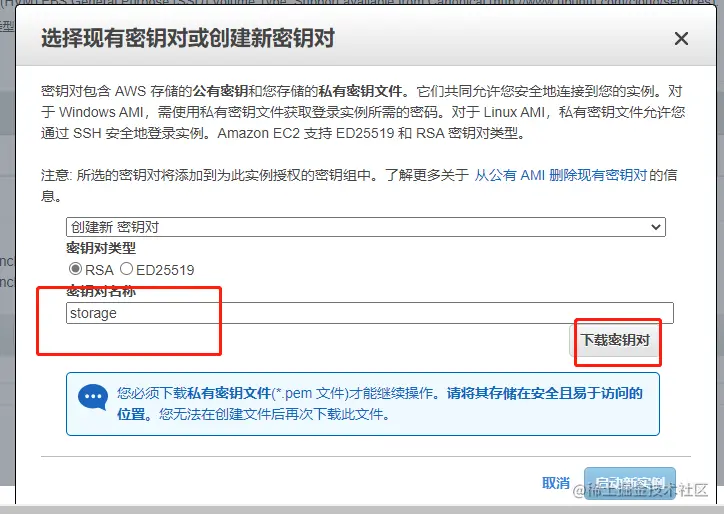 继续下一步之后,点“启动”,然后有个弹窗界面,弹窗界面用于创建密钥,用于登录实例,按提示创建保存即可。我这里选择创建密钥,名称为 storage,输入名称后点击下载,妥善保管密钥之后启动新示例即可。