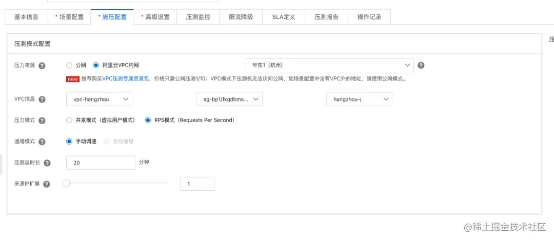 之后在压测来源中选择 阿里云 VPC 内网,需要注意的是这里的 region、VPC、安全组以及交换机信息必须与被测试服务保持一致: