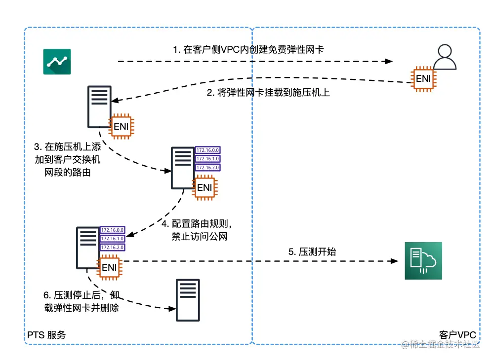 在场景构建完成,发起 VPC 内网性能测试时,PTS 侧主要会执行以下几个步骤: