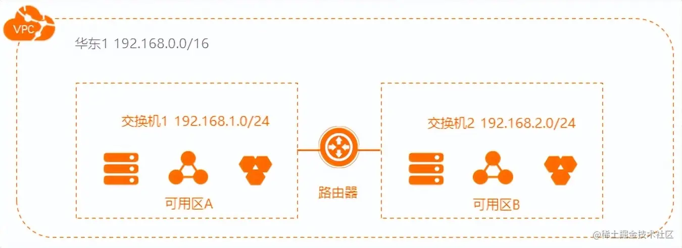 如下图所示,每个专有网络都由至少一个私网网段、一个路由器和至少一个交换机组成。