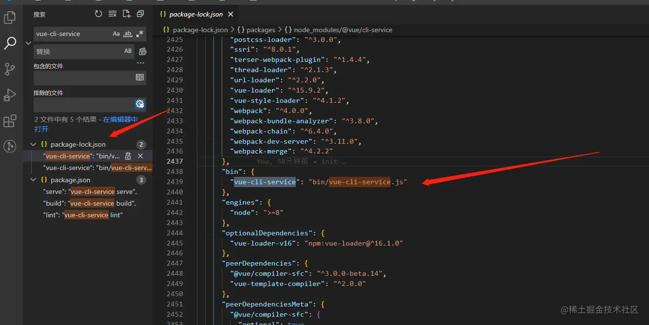 从 package-lock.json 中可知,当我们npm i 整个新建的vue项目的时候,npm 将 bin/vue-cli-service.js 作为 bin 声明了。
