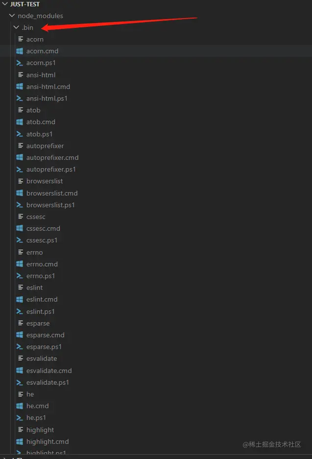 .bin 目录,这个目录不是任何一个 npm 包。目录下的文件,表示这是一个个软链接,打开文件可以看到文件顶部写着 #!/bin/sh ,表示这是一个脚本。