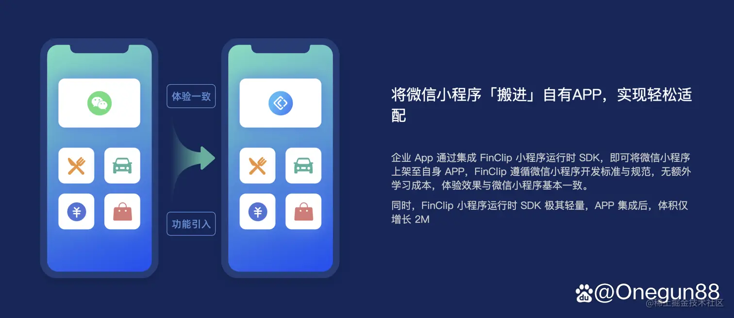 而且 FinClip 是完全遵循兼容微信小程序的开发标准与规范。也就是说,如果你本身已经开发好了一个微信小程序,可以在不改一行代码的情况下,直接放进你的 App 里面,运行效果和在微信上面保持一致,不必额外二次开发和改造,大大节省了人力成本。