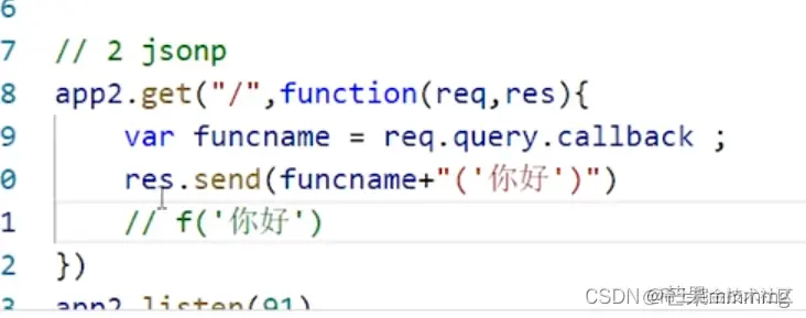 来,我们解释一下:首先通过第一个script脚本注册一个函数f,那么这个函数自然就存在了,后面使用的脚本也能用f这个函数,这个道理和你用script引入一个jquery然后后面用 $ 开始一通操作是一样的道理。然后第二个script脚本访问一个跨域的资源,然后我们传入参数callback=f,这个参数有什么用呢?答:后端需要获取这个callback参数里面的值,然后把这个值(也就是f)拼接成一个函数然后返回回来给前端执行,对应后端代码如图。