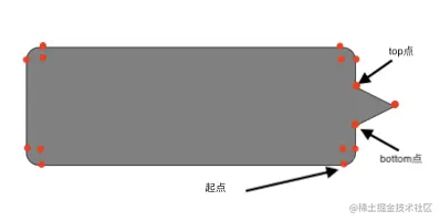 图描述:红色的是点,从图可知,四个角分别都有三个点,这里要做圆角处理,我暂时想到的是用 addArcWithCenter 方法来画弧线,里面的角其实是一个圆点。对于圆的角度如下图(这个圆形图借用了其它博主的):