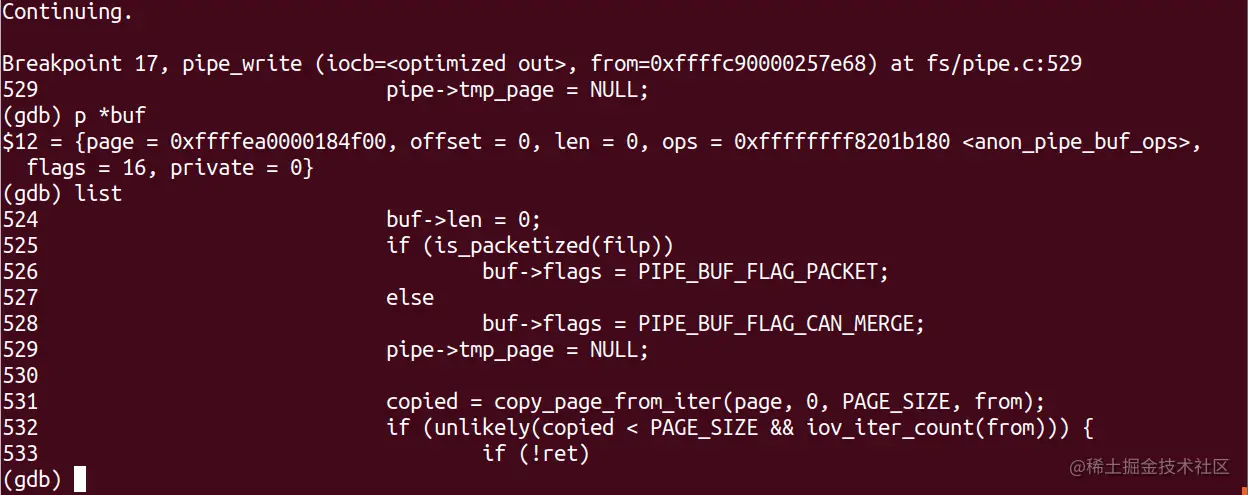 当我们给pipe->tmp_pipe = NULL下断点后,可以看到当我们执行exp后的flags设置为0x10(PIPE_BUF_FLAG_CAN_MERGE)