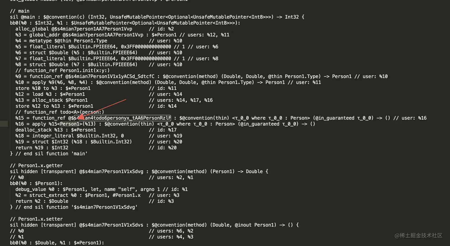 这个时候通过SIL文件我们可以看到这里还是使用Existential Container数据结构,但是上面我们说得使用Existential Container是为了管理遵守了相同协议的协议类型以及内存对齐,从上面的代码上看这个时候编译器是知道传进去的是Person1类型的对象,故这个时候我们可以使用泛型Generic code来实现。