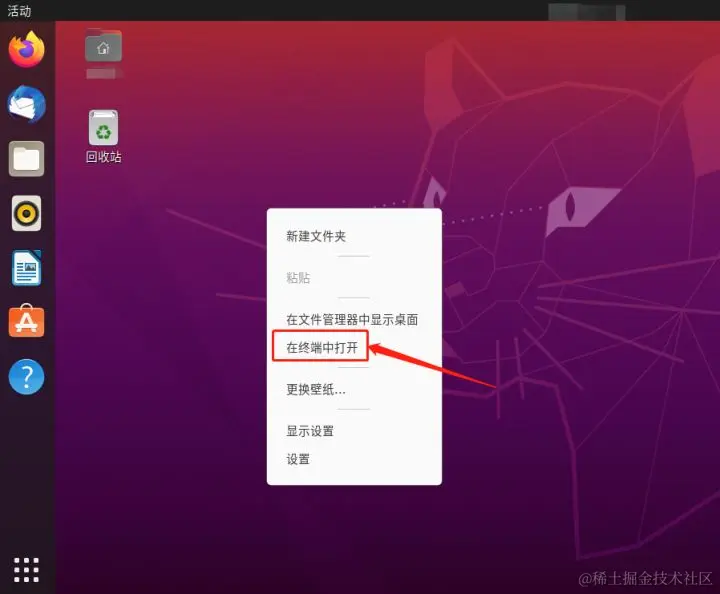 首先进入Ubuntu桌面,点击鼠标右键,并在弹出的菜单中选择“在终端中打开”选项,进入命令行模式。