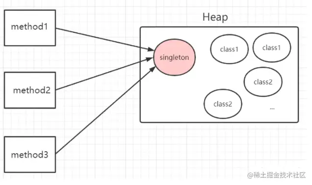 在应用程序运行期间,单例模式只会在全局作用域下创建一次实例对象,让所有需要调用的地方都共享这一单例对象,如下图所示: