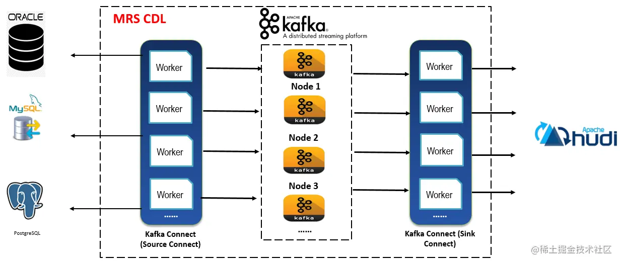 - 使用实时数据接入工具,配置关系数据库作为源端,配置Hudi文件的目录作为目的端(表B,文件格式是Hudi);