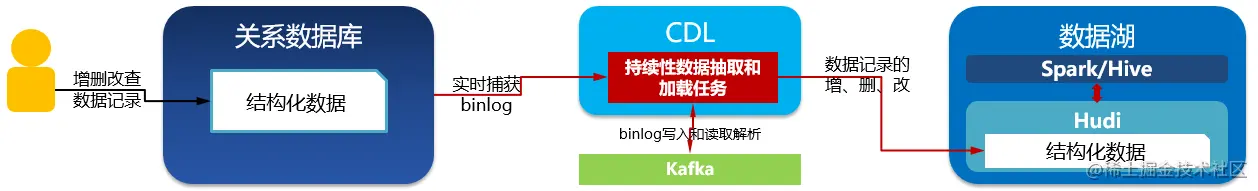 - 关系数据库的数据变化日志被实时捕获到入湖工具;
