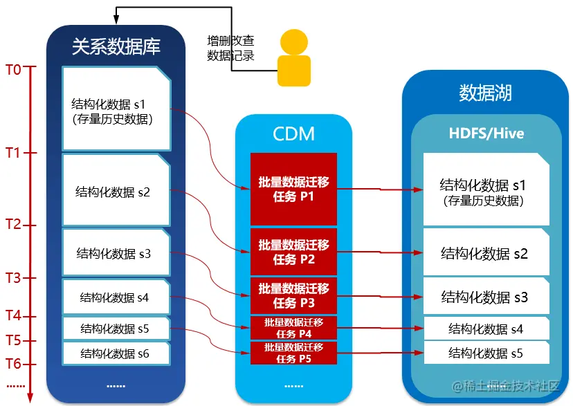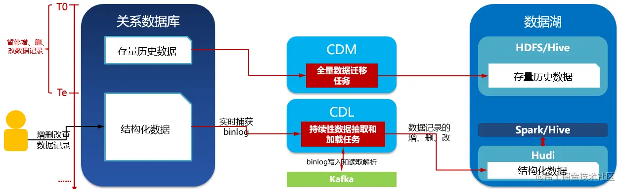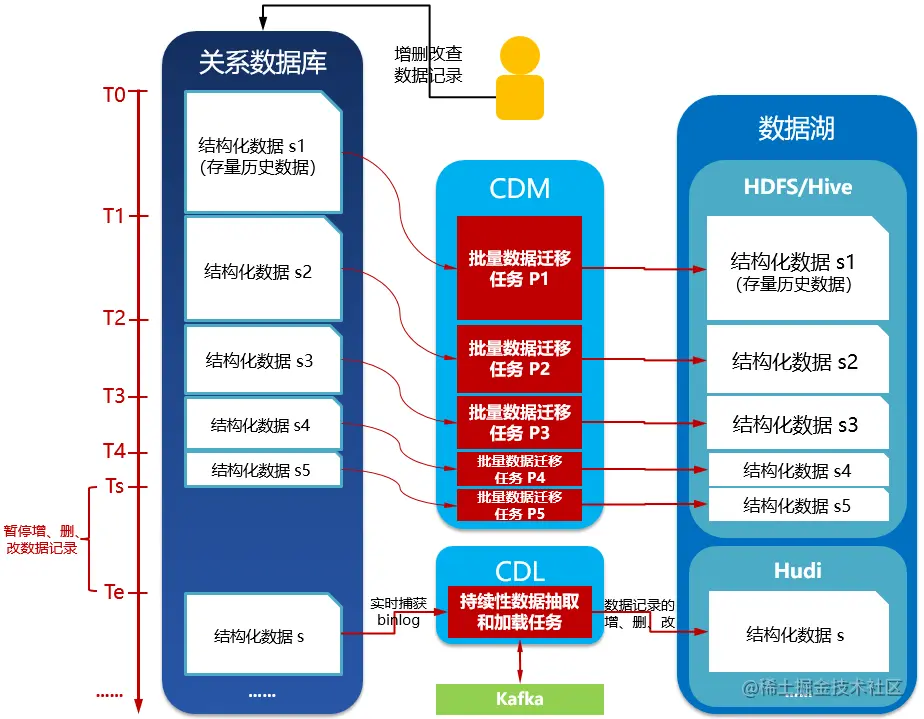 - 某时间点Ts暂停关系数据库的数据写入,确保Ts之前的数据全部由批次作业迁移到了HDFS目录(数据湖贴源层);