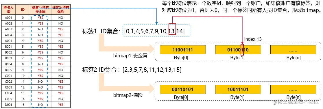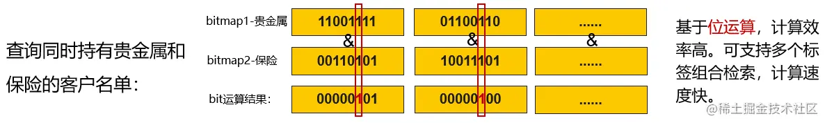 当我们需要查询同时有这个标签的用户时,基于位图索引,只需要将两个标签相应的位图进行位运算,即可得到最终结果。这样,标签数据的存储空间占用非常小,标签计算的速度非常快。