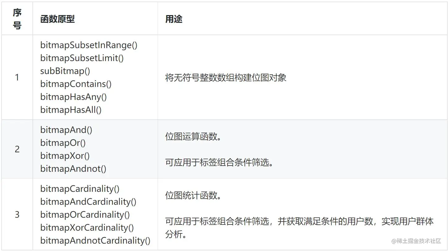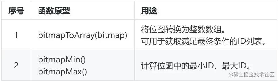 | 1 | bitmapBuild(array) | 将无符号整数数组构建位图对象 |