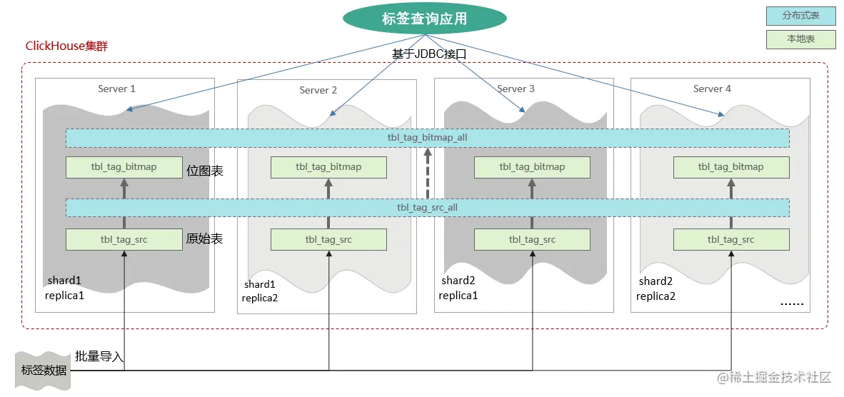 在ClickHouse中创建一张原始标签表,将原始标签数据导入其中。然后基于标签原始表构建标签位图表,并创建对应的分布式表。上层标签查询应用基于标签位图表(分布式表)进行标签查询。