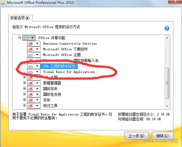 别的选项都可以不用安装,只安装VBA 工程的数字证书及Vsual Basic for Applications这两项。之后单击继续,安装完成后,我们的问题就解决了。