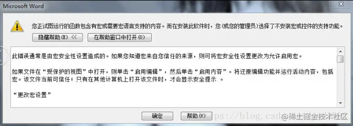 OFFICE 2010在安装的时候选择了自定义安装,在使用过程中发现,打开或者关闭WORD的时候,总是提示“:“您正试图运行的函数包含有宏或需要宏语言支持的内容。而在安装此软件时,您(或您的管理员)选择了不安装宏或控件的支持功能”。