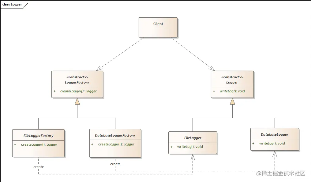 Product:抽象产品ConcreteProduct:具体产品实现了抽象产品的不同接口Factory:抽象工厂声明返回产品对象的工厂方法;注意,在实际开发中,它最主要的职责不是创建产品,而通常包含一些与产品相关的核心业务逻辑,该抽象工厂将逻辑处理从具体产品类中分离出来ConcreteFactory:具体工厂,重写抽象工厂类,使其返回不同类型的产品;并不一定每次调用工厂方法都会创建新的实例,工厂方法也可以返回缓存、对象池或其他已存在的对象