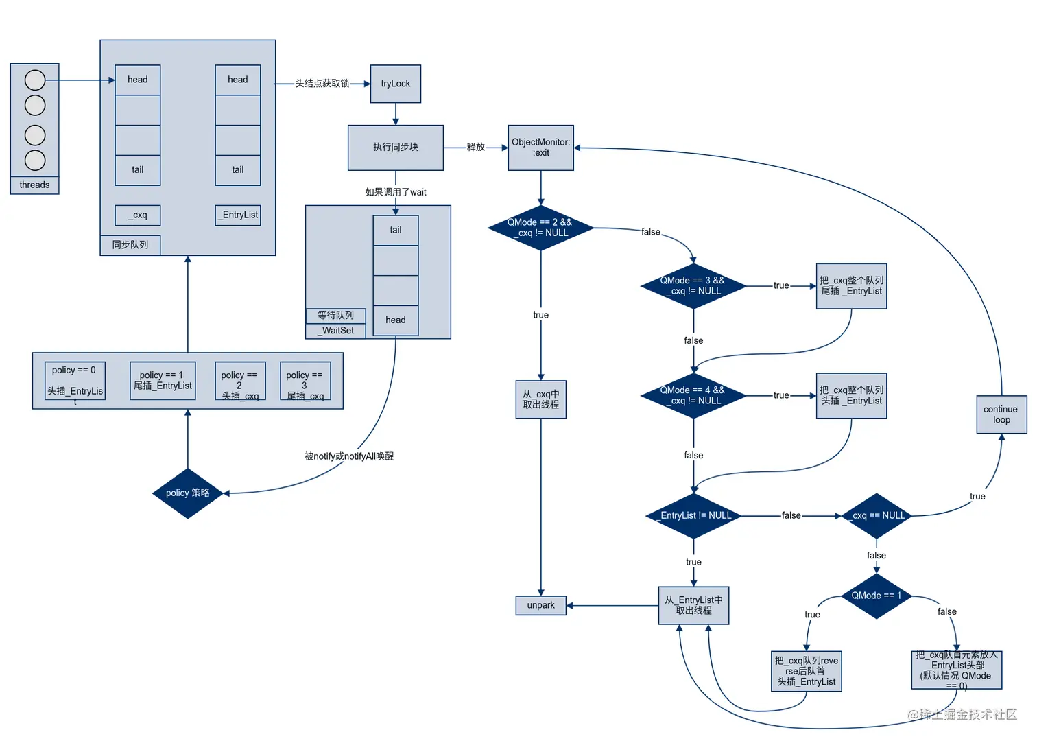 notify或notifyAll唤醒时根据policy策略选择加入的队列(policy 默认为 0) - 退出同步块时根据