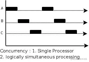 指在同一时刻只能有一条指令执行,但多个进程指令被快速的轮换执行,使得在宏观上具有多个进程同时执行的效果,但在微观上并不是同时执行的,只是把时间分成若干段,使多个进程快速交替的执行。这就好像两个人用同一把铁锨,轮流挖坑,一小时后,两个人各挖一个小一点的坑,要想挖两个大一点得坑,一定会用两个小时。