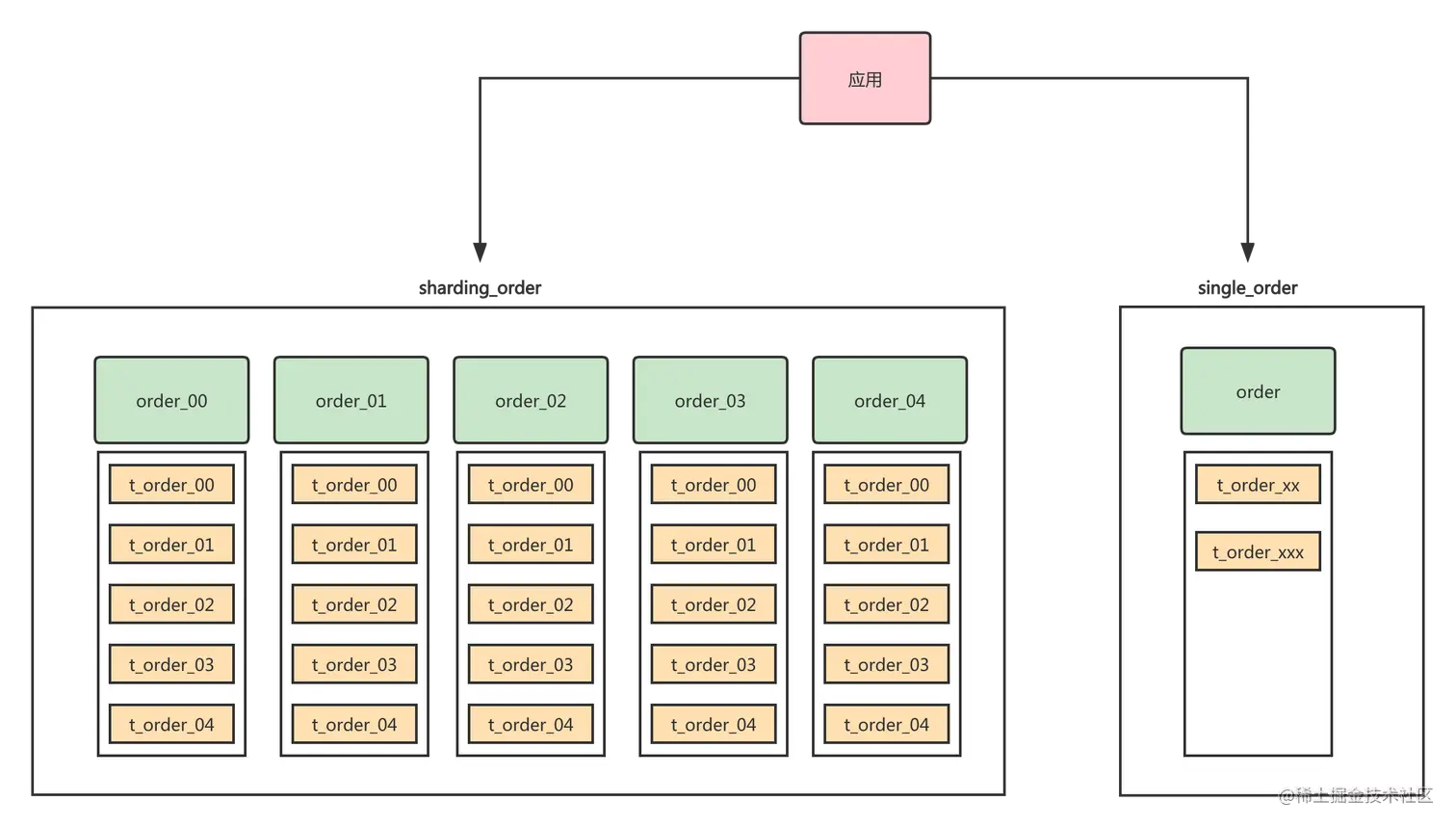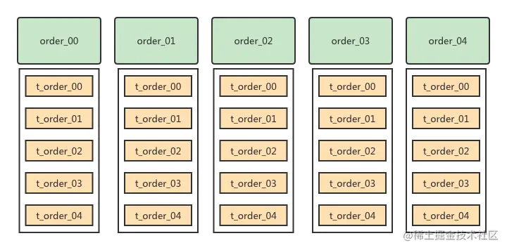 这里的5个数据库,你可以根据情况来决定是否需要5个独立的数据库实例。如果前期查询量没那么大,并且想节省成本的话,那么可以将order_00,order_01放在一个实例上。order_02,order_03,order_04放在一个实例上。这样你就只需要2个数据库实例。