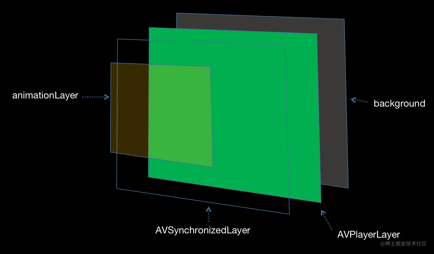 AVMutableVideoComposition拥有一个AVVideoCompositionCoreAnimationTool类型的属性animationTool,构建AVVideoCompositionCoreAnimationTool的常用是+ (instancetyp*)videoCompositionCoreAnimationToolWithPostProcessingAsVideoLayer:(CALayer *)videoLayer inLayer:(CALayer *)animationLayer;,其中要求我们传递了两个CALayer的对象,一个VideoLayer一个animationLayer,苹果官方文档解释,将视频的合成帧与animationLayer一起渲染形成最终的视频帧,videoLayer应该在animationLayer的子图层中,animationLayer不应该来自或被添加到任何其他的图层树中。