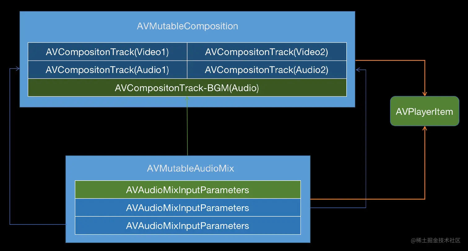 AVMutableAudioMix 包含一组 AVAudioMixInputParameters,每个 AVAudioMixInputParameters 对应一个它控制的音频 AVCompositionTrack。