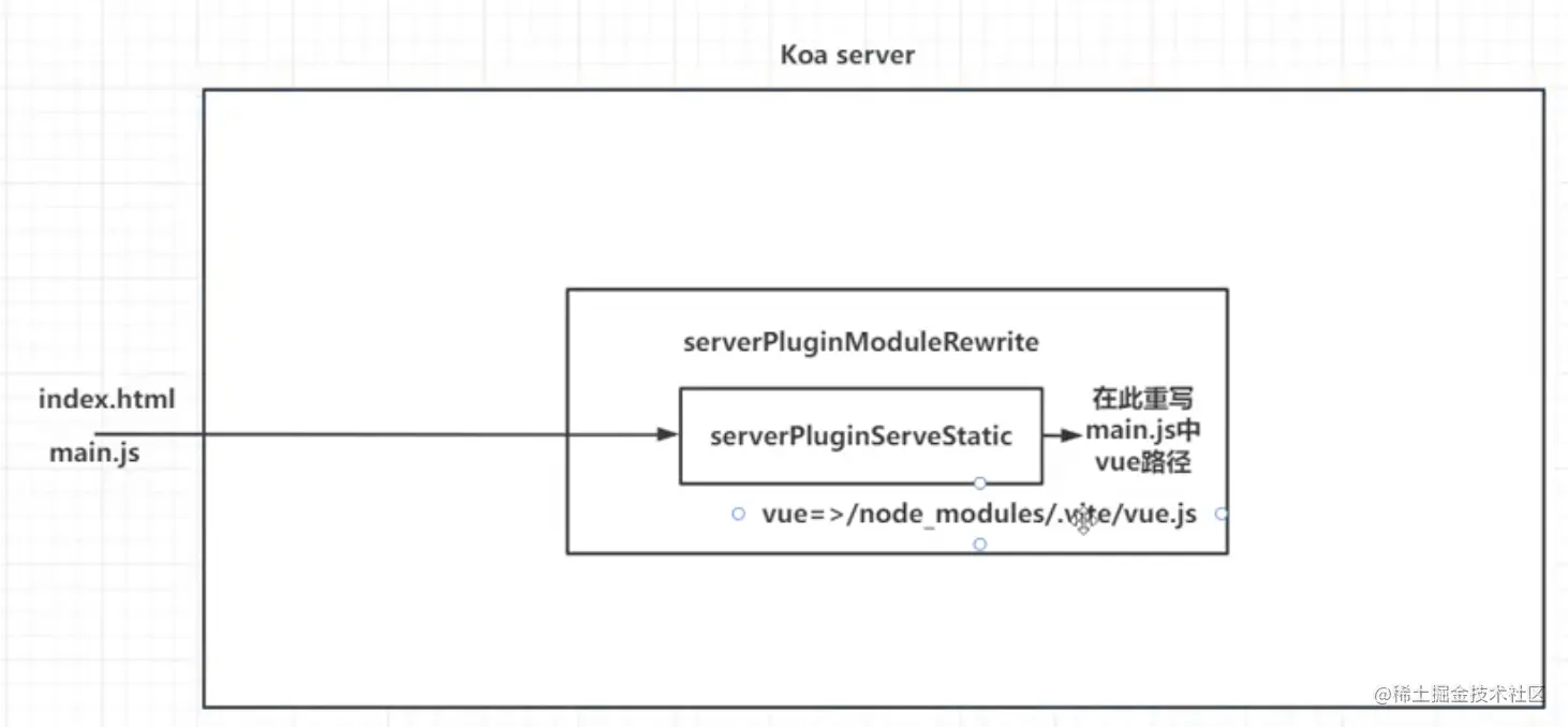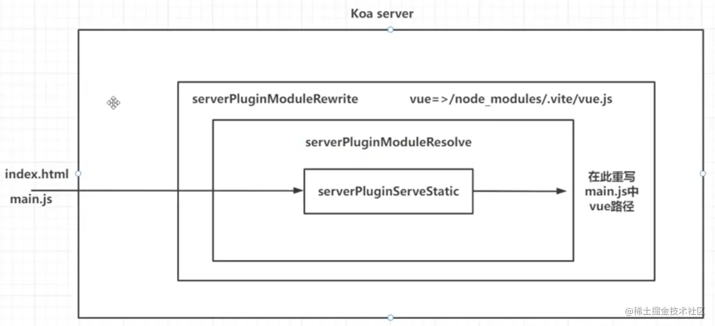但实际上,服务器中并没有/node_modules/.vite/vue.js这个路径,所以这个路径其实是个逻辑上的路径而不是物理路径,所以我们还需要写一个插件去对这个逻辑路径进行解析——serverPluginModuleResolve,这个插件要放在serverPluginModuleRewrite和serverPluginServeStatic中间: