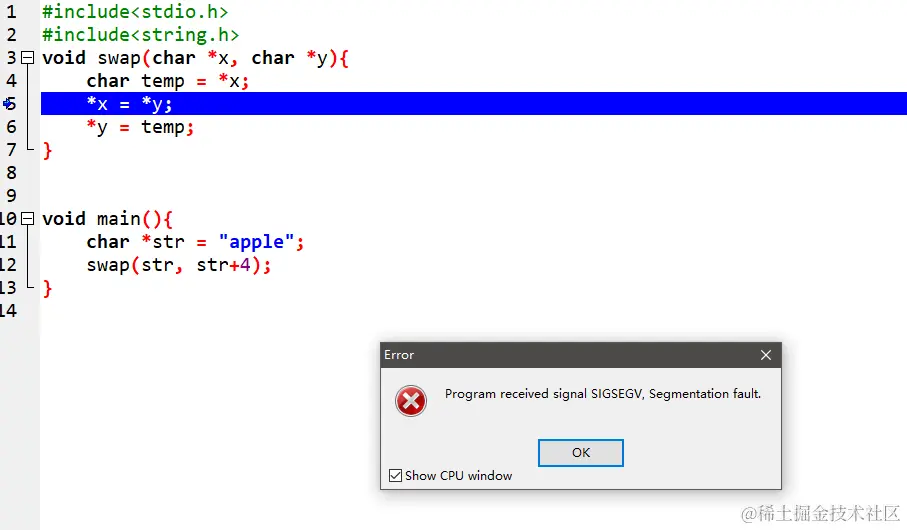 因此这个程序只需要把 char *str = "apple" 修改为 char str[] = "apple" 即可。如下: