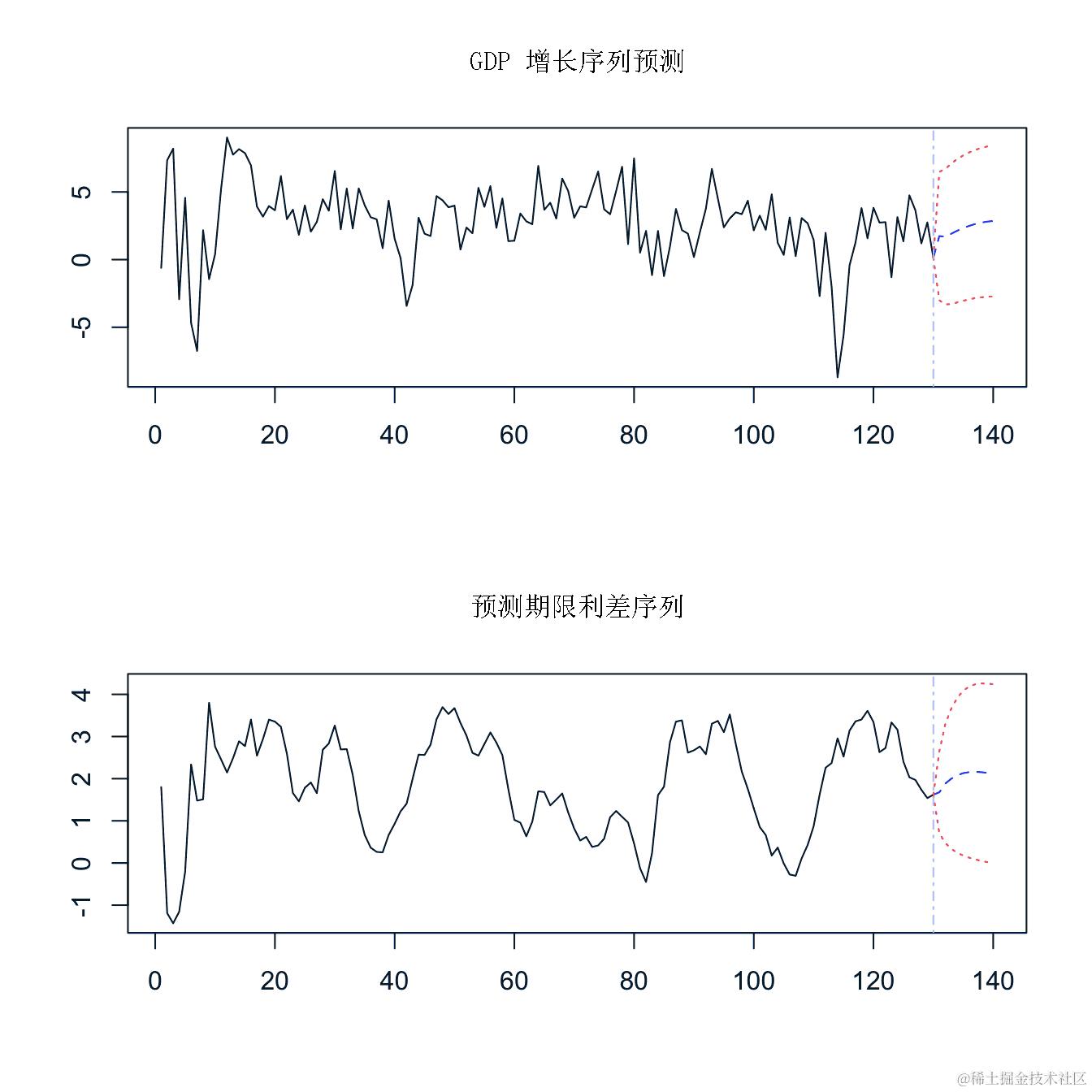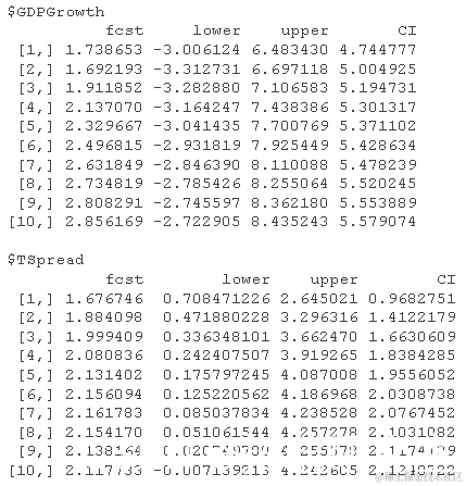 下面的代码块显示了如何使用模型对象VAR_est计算到2015:Q1期间的GDP增长和期限利差的迭代预测,也就是h=10。