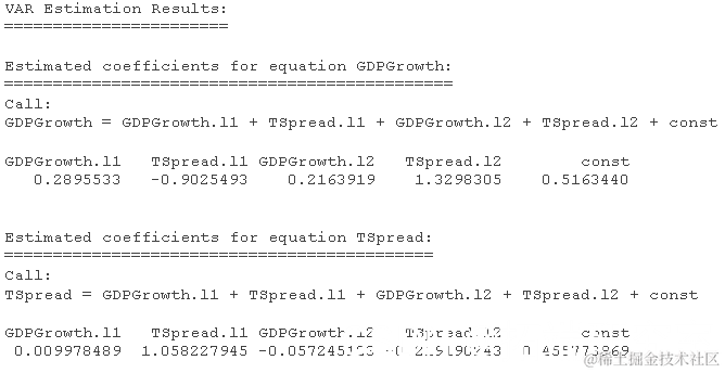 我们现在展示如何估计 GDP 增长率 GDPGR 和期限价差 TSpread 的 VAR 模型。关于 GDP 增长非平稳性的讨论,我们使用 1981:Q1 到 2012:Q4 的数据。两个模型方程是